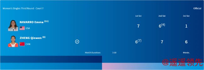 决胜盘中,郑钦文越战越勇,在第1局和第3局接连破发,以4-0领先。纳瓦罗保发后,郑钦文在第7局再次破发,以6-1获胜,大比分2-1逆转晋级八强。整场比赛耗时3小时10分钟。此时距离混双首轮比赛只剩40分钟。