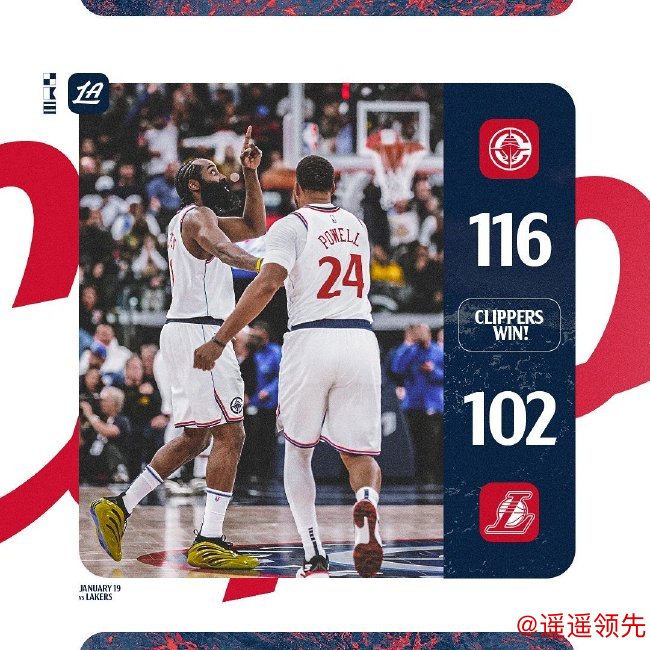 北京时间1月20日,NBA常规赛,快船116-102轻取湖人,快船取得4连胜稳居西部第五,湖人输掉卡位战继续排名西部第六。