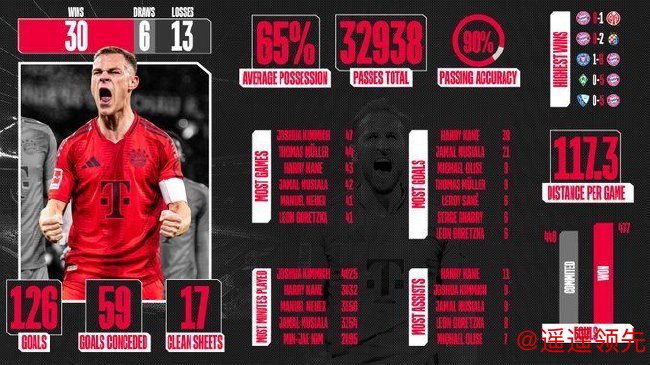 2024年,拜仁在各项赛事中取得了30胜6平13负的战绩,总共打进126球,丢59球,其中有17场比赛零封对手。